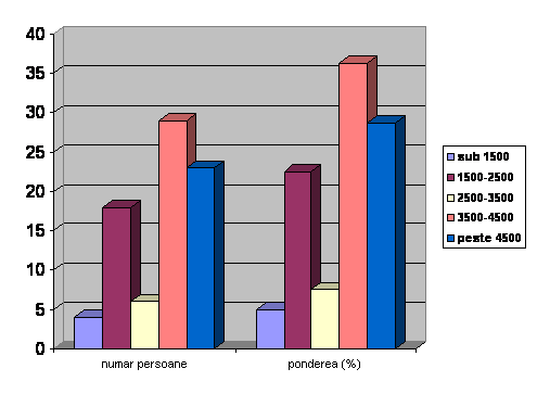 - ponderea persoanelor cu venituri lunare de sub 1500 ron este destul de mica 5%; iar cei cu salariul mediu net peste 4500 ron este de 28.75%.