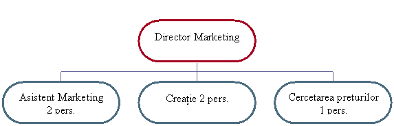 Departamentul marketing este in prezent format din sase persoane cu functii diferite cum ar fi doi asistenti de marketing care decid in majoritatea problemelor, doua persoane la customer services si doua la creatie. Departamentul este condus de directorul de marketing care supervizeaza activitatea de ansamblu si ia decizii in legatura cu problemele cheie care apar la nivel de departament. In randul atributiilor intra cele care privesc investigarea pietei, proiectarea si fundamentarea politicii de marketing a firmei, a strategiilor si tacticilor aferente, precum si punerea in aplicare a deciziilor de marketing, contactul permanent al firmei cu piata, schimbarile intervenite in raporturile si pozitia firmei pe piata.
