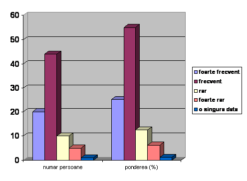 Se poate constata ca: 16 persoane cumpara foarte frecvent; cea mai mare pondere 30 persoane cumpara frecvent; 17 persoane cumpara rar; 8 persoane cumpara foarte rar si doar 9 persoane au cumparat o singura data.