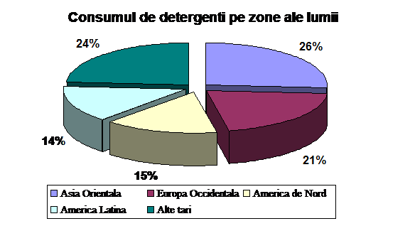 In ceea ce priveste consumul de produse casnice de curatat in anul 1998 s-a inregistrat un consum total de 17,5 milioane tone detergent. Acesta s-a distribuit pe principalele zone ale lumii astfel: Asia Orientala - 26%, Europa Occidentala - 21%, America de Nord - 15%, America Latina - 14%, Alte tari - 24%.