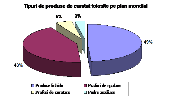 In lume productia totala de produse de curatat si spalat se structureaza astfel: produse lichide 49%, prafuri de spalare 43%, prafuri de curatare 5%, pudre auxiliare 3%.