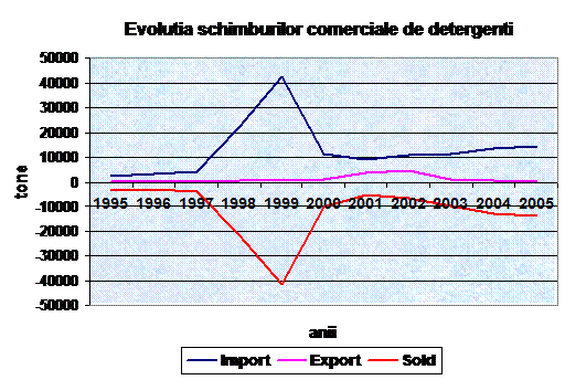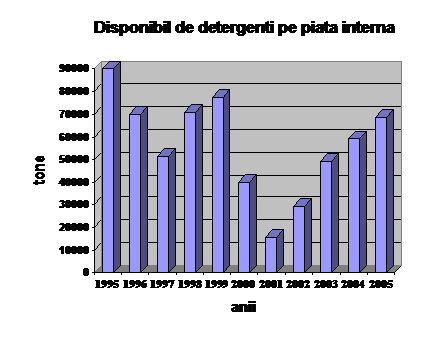 Cantitatea de detergenti disponibila pe piata interna, dupa ce a atins un prag minim in 2001 de 15645 tone, este intr-o usoara crestere, fara a atinge nivelul inregistrat in 1995. Situatia este considerata favorabila avand in vedere ca disponibilul de detergenti de pe piata la un moment dat este egal cu cererea pentru aceasta categorie de produse.