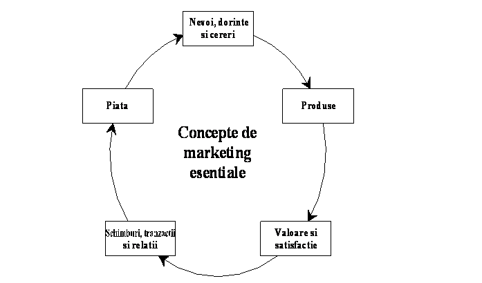 Pentru a aprofunda defnitia de mai sus, vom analiza termenii mai importanti: nevoi, dorinte si cereri, produse; valoare si satisfactie; schimburi, tranzactii si relatii; piete. Din figura urmatoare se observa relatia dintre aceste concepte si modul cum fiecare se bazeaza pe cel anterior.