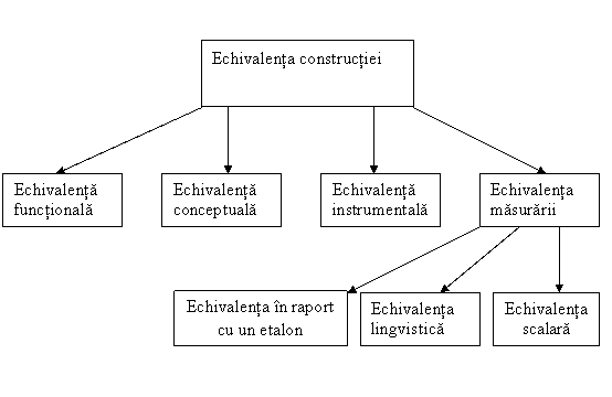 In cercetarile de marketing international este necesara realizarea unei echivalente intre scalele folosite in cadrul studiilor pe mai multe tari, in vederea asigurarii unui mod unitar de masurare a acelorasi fenomene. Este importanta asigurarea unei echivalente a constructiei, adica atribuirea aceleiasi semnificatii diferitelor constructii de marketing (scale, variabile) in toate tarile in care se desfasoara cercetarea. Estimarea echivalentei constructiei presupune asigurarea mai multor tipuri de echivalente, dupa cum urmeaza[2]:
