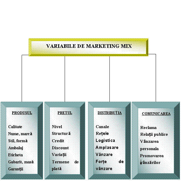 Mixul de marketing va sintetiza si manipula unitar si coerent, in bloc cele patru variabile - cheie ale actiunilor de pe piata, astfel: