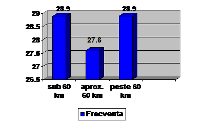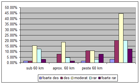 In cercetarea realizata am incercat sa observ care este distata pe care bistritenii ar fi dispusi sa o parcurga pentru un sejur de week-end si pornind de la premisa propunerii statiunii Sangeorz Bai ca si destinatie de sfarsit de saptamana am luat ca si reper distanta de 60 km (distanta aproximativa dintre Bistrita si Sangeorz Bai). Rezultatele obtinute se prezinta conform tabelului si garficului de mai jos: