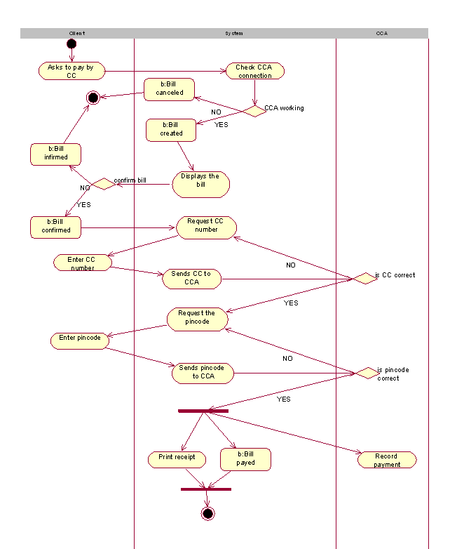 - this package contains classes that are used in the Pay by Credit Card use case. PaymentManager is the controller of the class, and is responsible of getting credit card information from the client, communicating with CCA for validity of the client data, and for creating and printing the bill. PaymentManager implements the lazy-loaded singleton pattern. Bill contains all information regarding the bill for a client. Receipt is the class that prints the receipt of a payment information of a bill. CreditCardData is an object used in the communication with CCA to allow checking of credit card validity for a client. Payment is the information sent to CCA to perform a payment into the client account.