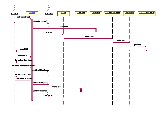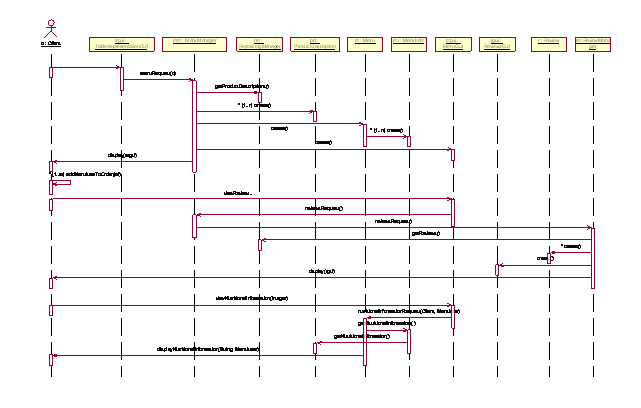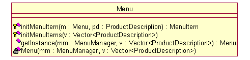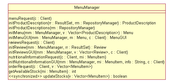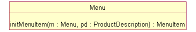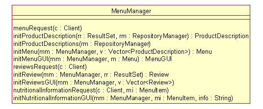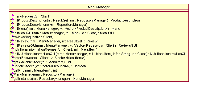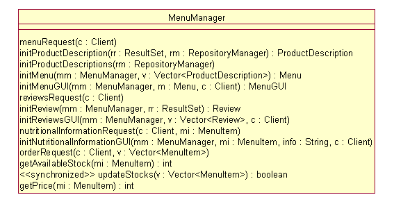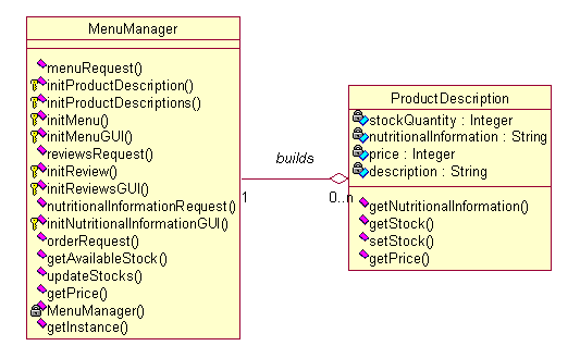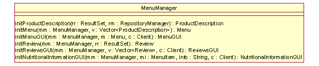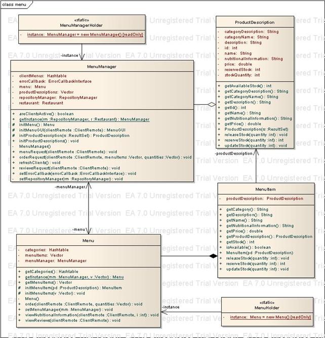 - contains all the classes needed to realize the Browse the Menu use case. ProductDescription is a class enclosing all information of a product from the repository and provides methods for reserving/releasing quantities for a client order. The Menu is composed of MenuItems which reference ProductDescriptions and catches events from the client regarding the menu and sends them to the MenuManager. The MenuManager is the controller for the Browse the Menu use case and handles all requests for a Menu and MenuItems. MenuManager and Menu both implement the lazy-loading Singleton pattern.
