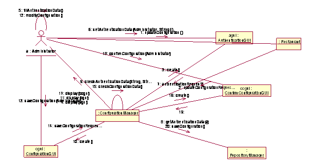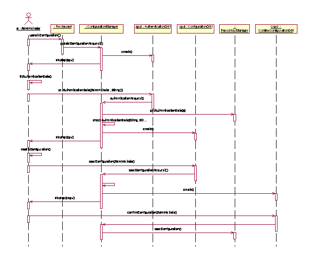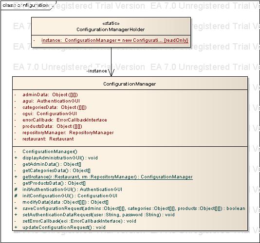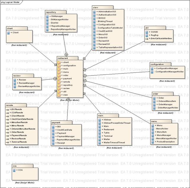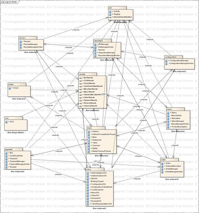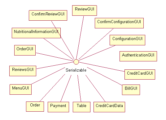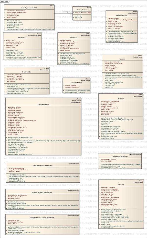 - this is the View component in the Model-View-Controller architecture pattern. Here are defined all graphical interfaces that are displayed by the system. All interfaces that are to be displayed on the remote terminals are to be network-accessible, and this is achieved by extending JFrame (which is a Serializable type (see Marker Interface pattern described earlier) and by using remote interfaces of real objects: TableRepresentationGUI (displays the table representation mapping with the current table button marked yellow), MenuGUI (displays the menu interface), OrderGUI (displays the order interface), BillGUI (displays the bill interface), CreditCardGUI (displays the credit card interface), ReviewGUI (used when writing a review), ReviewsGUI (used to read saved reviews). TableRepresentationGUI also defines an internal class BlinkingThread that will be used when the table button will start blinking to notify that the waiter timeout elapsed. All other interfaces AdministrationGUI (displays the interface that allows the administrator to enter the Configure the System use case), ConfigurationGUI (interface allowing editing the configuration of the system) and AuthenticationGUI (admin authentication interface) are used for editing the system configuration. ConfigurationGUI also defines three internal classes IntegerEditor (used to restrict entering values in a table cell to an integer value), DoubleEditor (used to restrict entering values in a table cell to double value), and UniqueStringEditor (used to restrict entering unique per column values in a table).