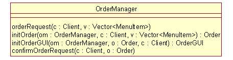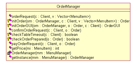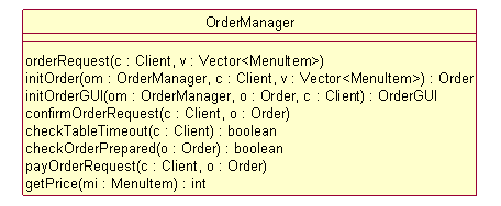 this package contains classes that are used for Place the Orderd and also in the Process the Order use cases. OrderManager is responsible for receiving order requests from the clients, asking for confirmations, sending the orders to the kitchen, permanently checking if the orders are prepared, and notifying the waiters of order status changing and when they must check their tables if too much time has elapsed. OrderManager implements the lazy-loading Singleton pattern. The Order is composed of OrderedMenuItems and contains all information related to a client order, also catches all events from the client regarding his order, events that are delegated to the OrderManager.