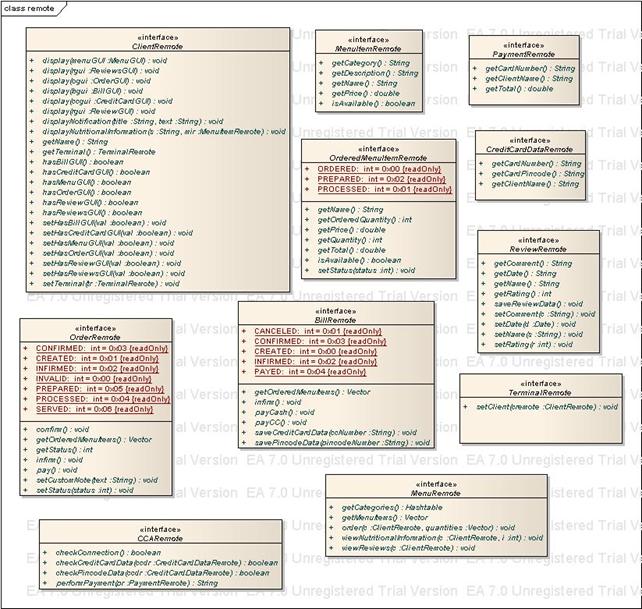 because the system is intended to run in a physically distributed environment, here are all remote interfaces that are to be implemented by real classes in the system so that their objects to become network accessible between remote parts of the system. Each remote interface acts as a stub for the real object in the system/remote system. Since different parts of the system must communicate using common system objects, and since those objects may reside in different name spaces (why not, different machines), this interfaces help declaring previously known public interfaces for the objects that are to be shared between different parts of the system. As seen by me, the system may be distributed as following: the terminals that are on each table (so all the information that need to be used by/retrieved from the thin clients running on the terminals must make use of such remote interfaces for the necessary objects), the CCA system which is on a different machine (a different building, company etc, so all communication to/from CCA must use a remote interface of the CCA system which is defined and declared by CCA and known by the restaurant system, and, moreover, all information sent to CCA must use remote interfaces that need to be known by CCA too) , and the main system. So all information that need to be shared between terminals and the main system, and between CCA and the main system need to be publicly known by both parts interested in the communication. This is the role of the xxxRemote interfaces defined in this package. ClientRemote (stub for Client) is needed because the client is sited at one of the restaurant tables, using a terminal that is network-accessible by the system, and the restaurant must know of a way of sending him necessary data. TerminalRemote is used for associating clients to terminals (simulation of a client who sits at a table and starts using the terminal on the table). MenuRemote and MenuItemRemote are used for displaying menu information to the client. MenuRemote is also used to catch all events sent by the client regarding the menu. OrderRemote and OrderedMenuItemRemote are used to display order information to the client. OrderRemote is also used to catch all evens sent by the client regarding his order. BillRemote is used to display bill information to the client and to catch client events regarding the bill. CCARemote is the interface for the CCA system that is used by the restaurant. PaymentRemote and CreditCardDataRemote represent information that is sent to CCA system when performing a payment/checking some credit card data validity.