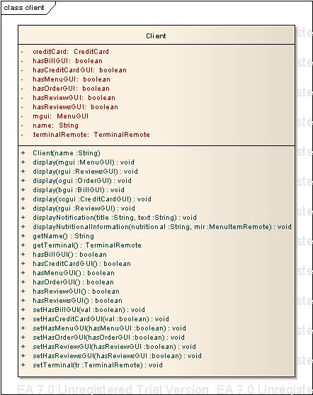 - this package is a simulation of a real client that enters the restaurant and starts interacting with a terminal. It contains the Client that defines the client details, and is used by the restaurant to send data (graphical interfaces for instance) and to receive signals (of course, using the ClientRemote interface - see restaurant.remote description)