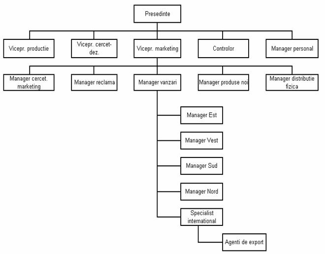 - structura organizatorica, ce cuprinde: aprovizionare, productie, cercetare-dezvoltare, vanzari, distributie, marketing;