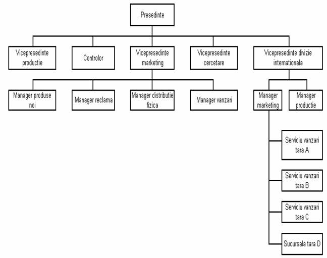 2) structura de organizare functionala - presupune ca directorii de marketing, finante, productie, contabilitate si cercetare-dezvoltare sa aiba responsabilitati globale. Acest tip de structura este potrivit firmelor cu linii de produse limitate sau omogene, cu o variatie redusa a produselor sau a pietelor geografice;