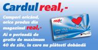 Un card de credit cu care poti cumpara oricand orice produs din magazinul real, in limita ce ti-a fost acordata. Orice persoana fizica cu varsta intre 18 si 69 de ani, angajat sau pensionar, considerata eligibila in urma analizei situatiei sale personale si financiare. Singurul cost pentru a deveni posesor al Cardului real,- este o taxa anuala de 16,9 RON pentru primul an, taxa care se plateste la emiterea primului extras de cont. Cand vrei sa platesti la casierie cu Cardul de credit real,-, casierii te vor intreba cum doresti sa rambursezi suma utilizata: cu perioada de gratie sau in rate. Alegi una dintre optiuni, apoi introduci codul PIN. Dupa ce semnezi chitanta de plata, nu vei mai putea schimba optiunea de plata.
