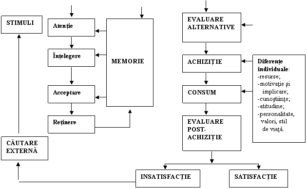Pentru majoritatea bunurilor si serviciilor, consumatorul obtine informatiile in mod pasiv, prin absorbirea inconstienta a mesajelor publicitare sau prin intermediul prietenilor si cunostiintelor. Exista si anumite situatii cand consumatorul se informeaza activ asupra unui anumit produs, astfel incat in loc sa absoarba pur si simplu informatia, consumatorul cauta sa se informeze. Marketerul intra pe scena, in timpul acestei cautari, prin punerea la dispozitia consumatorului a informatiilor corespunzatoare, de regula, printr-o publicitate atent planificata. In acel moment, consumatorul va decide cata atentie sa acorde publicitatii, pe baza interesului sau fata de mesajul sau mediul in care acestea apar. Urmatorul pas consta in intelegerea mesajului de catre consumator, dar marketerii trebuie sa fie foarte atenti deoarece mesajul poate fi interpretat intr-un alt mod decat cel prezentat. Intelegerea mesajului e urmata, apoi, de acceptarea si retinerea acestuia, lucru ce garanteaza ca mesajul nu va fi uitat pe viitor.
