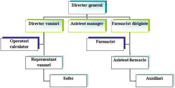Firma are 14 salariati, din care un director general,o asistenta manager, un director de vanzari, , un contabil, un operator calculatoare, un gestionar,doua farmaciste,doua asistente de farmacie, trei soferi, o femeie de servici (fig. 4.1)