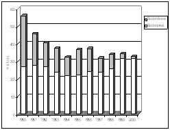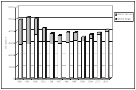 Scaderea efectivelor de pasari a inceput din 1989 si a continuat, cu cateva exceptii (anii 1990 si 1996) in intreaga perioada a reformei (figura 6.21.). In anul 1998 efectivele de pasari au fost cu 45% mai mici fata de efectivele din 1988.