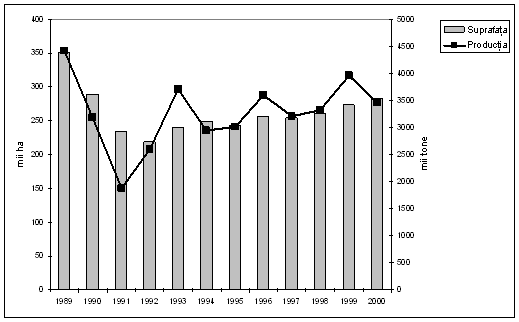 Pe fondul reducerii suprafetelor cultivate si al scaderii randamentelor la hectar s-a inregistrat o scadere mai accentuata a productiilor totale. (fig.11.13.)