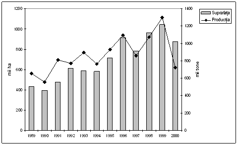Suprafata cultivata cu floarea soarelui a crescut in mod substantial dupa anul 1989 in special in perioada 1996-1998, ajungand in anul 1999 la aproape 1 milion hectare.