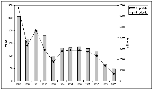 Productiile medii instabile si extrem de necompetitive comparativ cu potentialul acestei culturi (randamentele scazute de circa 20 t/ha sunt de 1,6-2 ori mai reduse decat cele obtinute in majoritatea tarilor CEFTA si de 2,5-3,3 ori mai mici decat in tarile U.E.) au avut drept rezultat o scadere dramatica a productiei totale.