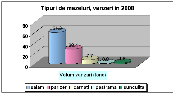 Asa cum reise din graficul de mai sus, putem observa ca volumul vanzarilor la salamuri este net superior celorlalte tipuri de mezeluri, procentul ob inut trecand peste jumatate din totalul vanzarilor ajungand la 61.3 %,urmate de parizer 28.4%,carna i 7.7.%, unculi a 1.8% i pastrama 0.8%