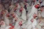 c) Adaposturile sunt reprezentate prin hale fara ferestre, avand dimensiunile de 100 m lungime si 18,4 latime, cu suprafata utila de 1600 m². In general, se amplaseaza in formatiuni de doua randuri, cu distanta de 50 m intre randuri si 7 m intre adaposturi. Fluxul tehnologic se desfasoara pe perioade de cate 49-56-63 zile, ritmicitatea fiind asigurata de periodicitatea lunara a popularii si depopularii halelor pentru tineret si a halelor pentru adulte. Prin respectarea vidului sanitar se reuseste ruperea ciclului evolutiv al germenilor patogeni si repopularea in spatii practice neinfectate de efective din seria anterioara. Dupa instalarea asternutului se formeaza tarcurile, in care se aseaza tavitele de furaje si adapatorile manuale. Cu 24 ore inainte de populare se verifica functionalitatea instalatiilor, se incalzeste adapostul, se asigura furajul si apa. Transportul de pui de rasa de carne din export se face cu mijloace speciale, dupa o verificare prealabila a conditiilor de microclimat(temperatura). Demarajul puilor pentru carne se face in spatii reduse, echipate cu eleveuze si utilaj pentru hranire si adapare. Tarcul, confectionat din PFL, trebuie sa aiba o forma circulara si se monteaza la o distanta cuprinsa intre 0.6 -1,0 m de la marginea eleveuzei. O hala este populata cu circa 216000 pui, revenind o densitate de 12-13 pui/m². La introducerea puilor, temperatura sub eleveuze, va trebui sa ajunga la 34-35C, iar in mediul ambiant la 25-26C. Apa va fi pusa cu 2-3 ore inaintea sosirii puilor. Furajul se administreaza o data cu introducerea puilor, pentru a fi proaspat. Regimul de lumina este de 23 ore pe intreaga perioada de crestere. In primele 3 zile se aplica tratamentul antistres.Vaccinarea antipseudopestoasa se deruleaza pe perioadele 8-10, 23-24 si 48-50 zile, cu vaccine La Sota (apa, aerosoli, conjunctival). Ultima vaccinare trebuie aplicata cu 7 zile inainte de livrare. La fiecare vaccinare se intervine antistresant cu Stresol 10 g +2ml colina la 10 litri apa.