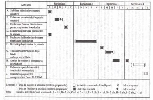 Sa consideram exemplul firmei ELAROM S.A., producatoare de articole electrocasnice, care doreste sa sporeasca eficienta sistemului sau de distributie imbunatatirea relatiilor cu firmele distribuitoare. In acest scop, compartimentul de marketing al firmei a elaborat programul de desfasurare a unei cercetari de tip calitativ, sub forma unor interviuri in profunzime, in randul unui esantion de firme angrosiste si detailiste, care includ in oferta lor produse ELAROM. Programarea activitatilor ocazionate de efectuarea acestei cercetari de marketing este ilustrata de diagrama Gantt din fig. 5.9.