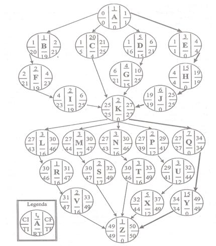 Dupa inscrierea duratei fiecarei activitati in nodurile retelei, termenele CI si CF se stabilesc prin parcurgerea retelei de la evenimentul initial spre cel final, respectiv de la activitatea A la activitatea Z. Valorile CI si CF se inscriu, de asemenea, in nodurile retelei PERT (fig. 5.10).