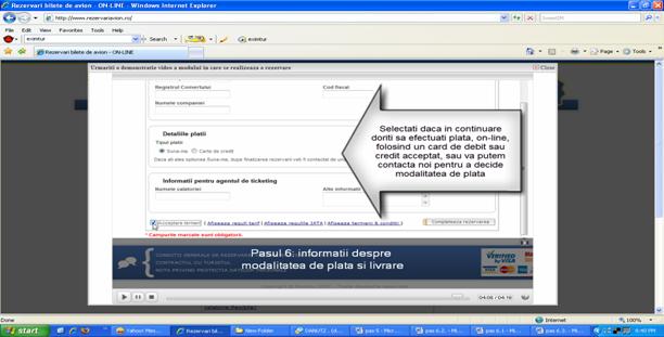 De asemenea clientul poate alege sa plateasca on-line, cu cardul de debit sau credit acceptat, sau sa fie contactat de agentie care va decide modalitatea de plata. Dupa ce sunt acceptati termenii prin bifarea casutei din stanga jos : acceptare termeni", se apasa pe butonul din dreapta jos "completeaza rezervarea" si rezervarea e finalizata cu success.