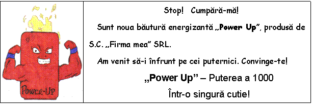 Invitatia de a cumpara noua bautura energizanta "Power Up" care a aparut pe piata.