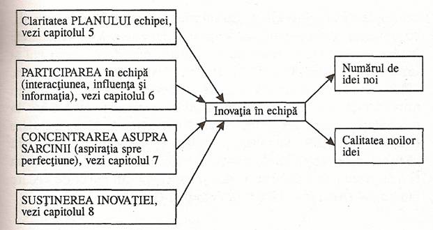 Figura 1 ilustreaza un model de inovatie in echipa, accentuand importanta unor factori fundamentali care au fost analizati in capitolele precedente (West si Anderson, 1996).