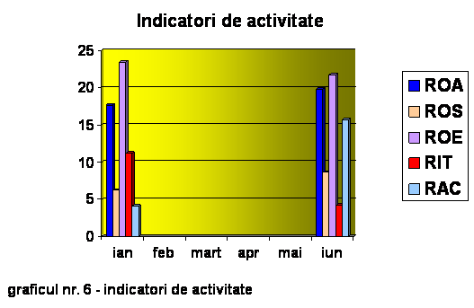 Din analiza indicatorilor de activitate graficul nr. 6 , se remarca o rata a rentabilitate a activelor foarte buna, ianuarie 2004 s-au inregistrat 17,67% iar in iunie 2004 19,87%. De asemenea rotatia creantelor inregistreaza o crestere datorita diminuarii creantelor neincasate la sfarsitul perioadei analizate, iar rotatia cstocurilor a scazut din cauza cresterii stocurilor in ultima perioada si scaderii in acelasi timp costului vanzarilor din cauza cresterii cheltuielilor cu salariile si scaderii cheltuielilor de exploatare .