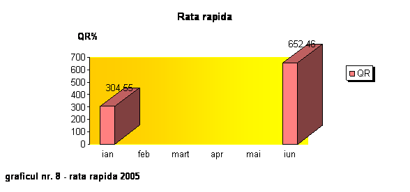 Se observa o crestere accelerata a ratei curente pe perioada analizata datorita scaderii accentuate a datoriilor pana la un an si cresterii activelor curente, astfel firma are o acoperire excedentara a datoriilor, inregistrandu-se valori "foarte bune" in ambele perioade analizate.