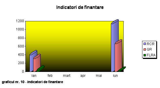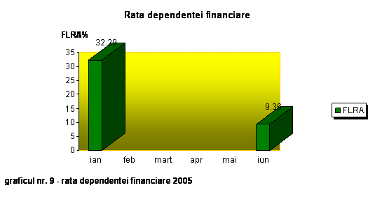 Din analiza indicatorilor de finantare graficul nr. 10 , se remarca valori foarte bune , disponibilitatile banesti ale firmei au capacitatea de a acoperi datoriile firmei , avand o acoperire excedentara a datoriilor. Totodata se remarca di o rata a dependentei financiare bun ace se datoreaza scaderii datoriilor pe perioada analizata in iunie 2005 avand 9,36%.