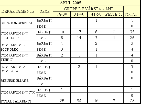 Structura salariatilor pe grupe de varsta si sexe, in dinamica ultimilor 3 ani, defalcati pe structura administrativa si productiva este redata in urmatoarele tabele: