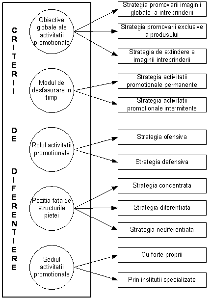 Activitatea promotionala poate fi diferentiata pornind de la cateva nivele si criterii, in functie de care vor fi formulate variante strategice specifice, prezentate in figura 9.1.