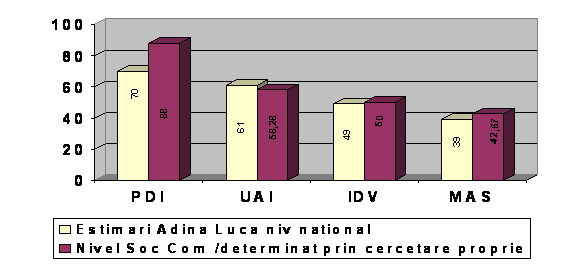 Specialistii apreciaza ca se pot obtine foarte multe idei originale si creative de la angajatii romani, dar va va fi mai dificil de implementat aceste idei.Din studiul efectuat, s-a putut constata ca este un demers dificil de pus componentii organizatiei, in situatia de a inova si a-si asuma responsabilitatea pentru aceasta, in special datorita nivelului ridicat de evitare a incertitudinii - UAI (in cazul nostru 58,5 foarte aproape de cel national 60, dar si datorita comportamentului de distantare fata de putere - PDI de 70 in organizatia studiata in raport cu 88 cel national.
