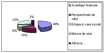 Rezultatele primite ne arata ca managementul de top al organizatiei are o politica salariala foarte buna, probabil ca acorda angajatilor mai mari salari ca concurenta, procentajul prntru avantajul salarial fiind chiar 48%. Aici se identifica inca o data chipa in care se lucreaza, insa in sens negativ, respectiv cu un procentaj foarte mic.