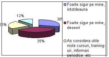 La aceasta intrebare raspunsurile angajatilor erau aproape de 33% de fiecare optiune, ce ne indica faptul ca in organizatie exista si angajati foarte bine calificati care sunt intotdeauna siguri pe ei, angajati bine calificati care sunt siguri pe ei insa nu permanent si a treia categorie de angajati sunt aceea care considera ca le sunt necesare niste cursuri, informari, seminare pentru a-si face treaba eficient.