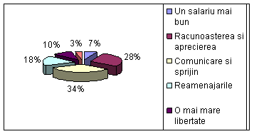 Procentele din imaginea de mai sus ne arata ca angajati au nevoie de comunicarea din partea colegilor, ceea ce s-a demonstrat si in raspunsurile din primele doua intrebari ale chestionarului, pe locul doi aflandu-se aprecierea pentru munca depusa care fac parte din politica de comunicare a organizatiei cu angajati care ar trebuie schimbata. De aici putem vedea ca organizatia este mai mult axata pe profitul si nu pe realizarea comunicarii dintre angajati, platind salari mari pentru a satisface muncitorii, procentul celor care si-ar dori un salariu mai bun fiind doar de 7%.