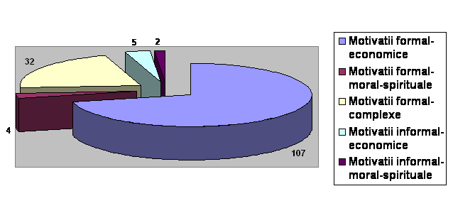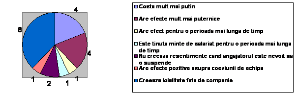 Astfel, din cei 21 de angajatori adepti ai sistemului de recompense non-financiare, 38,09% (respectiv 8 persoane), declara ca au fost determinati sa opteze pentru acest sistem de recompense deoarece creeaza loialitate fata de companie. Alte doua categorii de respondenti au declarat in egala masura alegerea motivarii non-financiare in detrimentul celei financiare pentru urmatoarele motive (cate 19,04%, respectiv cate 4 persoane): costa mult mai putin; are efecte mult mai puternice. O alta categorie de adepti ai sistemului de recompense non-financiare si-au explicat alegerea prin motivul ca aceasta nu creeaza resentimente cand angajatorul este nevoit sa o suspende (9,52%, respectiv 2 respondenti). In sfarsit, cate 1 singur respondent a motivat cu unul din celelalte trei raspunsuri ramase: