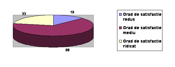 Raspunsurile la aceasta intrebare (evaluarea gradului de satisfactie in randul angajatilor proprii), nu puteau fi decat subiective, neexistand un instrument oficial decat tot chestionarul pentru a verifica aceasta. Totusi, spre surprinderea noastra, angajatorii respondenti din municipiul Bucuresti au fost modesti, numai 22% dintre acestia (33 persoane) considerand ca gradul de satisfactie de la nivelul angajatilor din organizatia proprie este ridicat. Cea mai mare parte a respondentilor, insa, a optat pentru gradul de satisfactie mediu al propriilor angajati (65,33%, respectiv 98 persoane). Numai 19 de persoane, reprezentand 12,67% din numarul total al angajatorilor chestionati au conchis ca este foarte probabil ca gradul de satisfactie al propriilor angajati este de nivel redus.