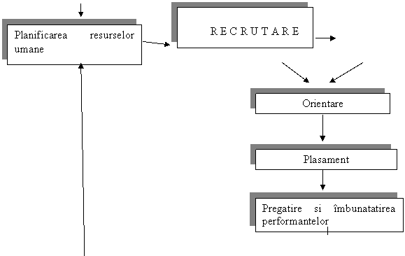 Recrutarea incepe prin specificarea necesarului de resurse umane (numar, abilitati, niveluri de experienta, programe de lucru), care constituie rezultatul tipic al analizei posturilor si al activitatilor de previzionare a necesarului de angajati. Pasul urmator in recrutare il constituie trierea initiala, adica o rapida si severa alegere a candidatilor, de multe ori, doar pe baza unor criterii subiective (aspect fizic, varsta, s.a.). Procesul de selectare ce urmeaza dupa trierea initiala este mai riguros, implicand testari comportamentale, interviuri, cercetarea referintelor, testari de cunostinte (v. figura nr. 2.1).
