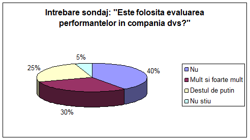 Procentul de 40% corespunzator companiilor care nu evalueaza performantele angajatilor se poate explica prin faptul ca aprecierea oamenilor se face direct si in mod subiectiv de cate sefi si nu in cadrul unui sistem coerent.