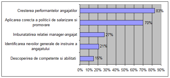 La intrebarea "Care ar fi beneficiile evaluarii performantelor?", foarte putini manageri sunt cei care apreciaza efectele evaluarii in procesul de imbunatatire a relatiei dintre manageri si angajati (27%) sau in cel de identificare a nevoilor de instruire a angajatilor (21%). Doar 15% considera ca ar putea descoperi competente si abilitati ale personalului cu ajutorul tehnicilor de evaluare.