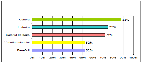 rezultatele evaluarii influenteaza cel mai mult dezvoltarea carierei 88%, posibilitatile de training (76%) si salariul de baza (72%)