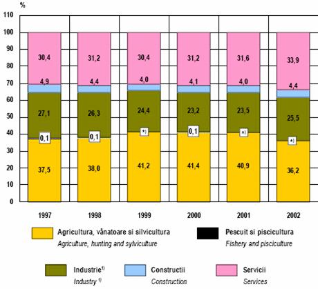 Demn de retinut este faptul cǎ incepand cu anul 2002 sectorul serviciilor - atat cele destinate populatiei, cat si intreprinderilor -a inregistrat un progres semnificativ, ca urmare a cresterii veniturilor si, in general, a evolutiei pozitive a economiei de piatǎ, nivelul acestui sector in PIB crescand cu aproape 13 puncte procentuale (de la 32,3% in 1990 la 44,7% in 2002). Astfel, ,,in anul 2002, agricultura si silvicultura contribuiau cu 11,7% la formarea PIB, industria cu 29,1%, constructiile cu 5,0%, iar serviciile cu 44,7%" .