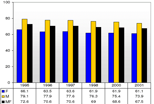 Daca facem o analizǎ asupra somajului care afecteazǎ cele douǎ sexe, putem observa cu usurintǎ cǎ ,,forta de muncǎ femininǎ este mai vulnerabilǎ in raport cu bǎrbatii"[15], intrucat rata somajului feminin este superioarǎ, indiferent de celelalte variabile (rata ocupǎrii feminine in 1997-45,2%, fata de 57,8% in 2002). Cu toate acestea, reducerea ratei de activitate pentru populatia masculina a fost de 9 puncte procentuale intre 1997-2002 (de la 72,5% la 63,5 in 2002), mai ridicata fata de scaderea inregistrata de populatia feminina de 8,7 puncte procentuale (de la 57,7% in 1997 la 49% in 2002), potrivit datelor cuprinse in Strategia pentru Ocuparea Fortei de Muncǎ 2004-2010. Relevante pentru identificarea ponderii populatiei ocupate pe sexe in totalul populatiei sunt si datele din graficul urmǎtor, chiar dacǎ cercetarea surprinde o perioadǎ mai scurtǎ (1995-2002).