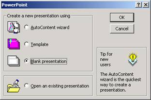 Cand se porneste prima data programul, caseta de dialog PowerPoint ofera optiuni pentru inceperea unei noi prezentari.